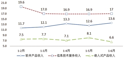 嵌入式系统软件收入增幅有所回落。上半年,全行业实现嵌入式系统软件收入4240亿元,同比增长6.6%,增速同比回落3.9个百分点,其中第二季度同比增长5.5%。