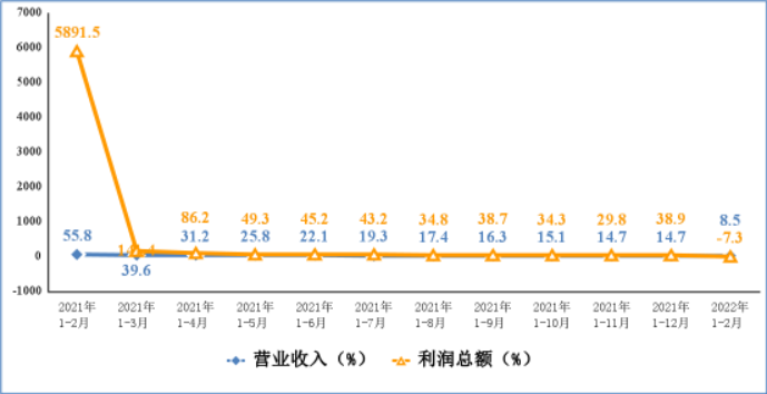 1-2月份,规模以上电子信息制造业实现营业收入20756亿元,同比增长8.5%,比2020年和2021年两年同期平均增速低6.8个百分点;实现利润总额725亿元,同比下降7.3%;营业收入利润率为3.5%,同比下降0.7个百分点,比同期工业营业收入利润率低2.5个百分点。